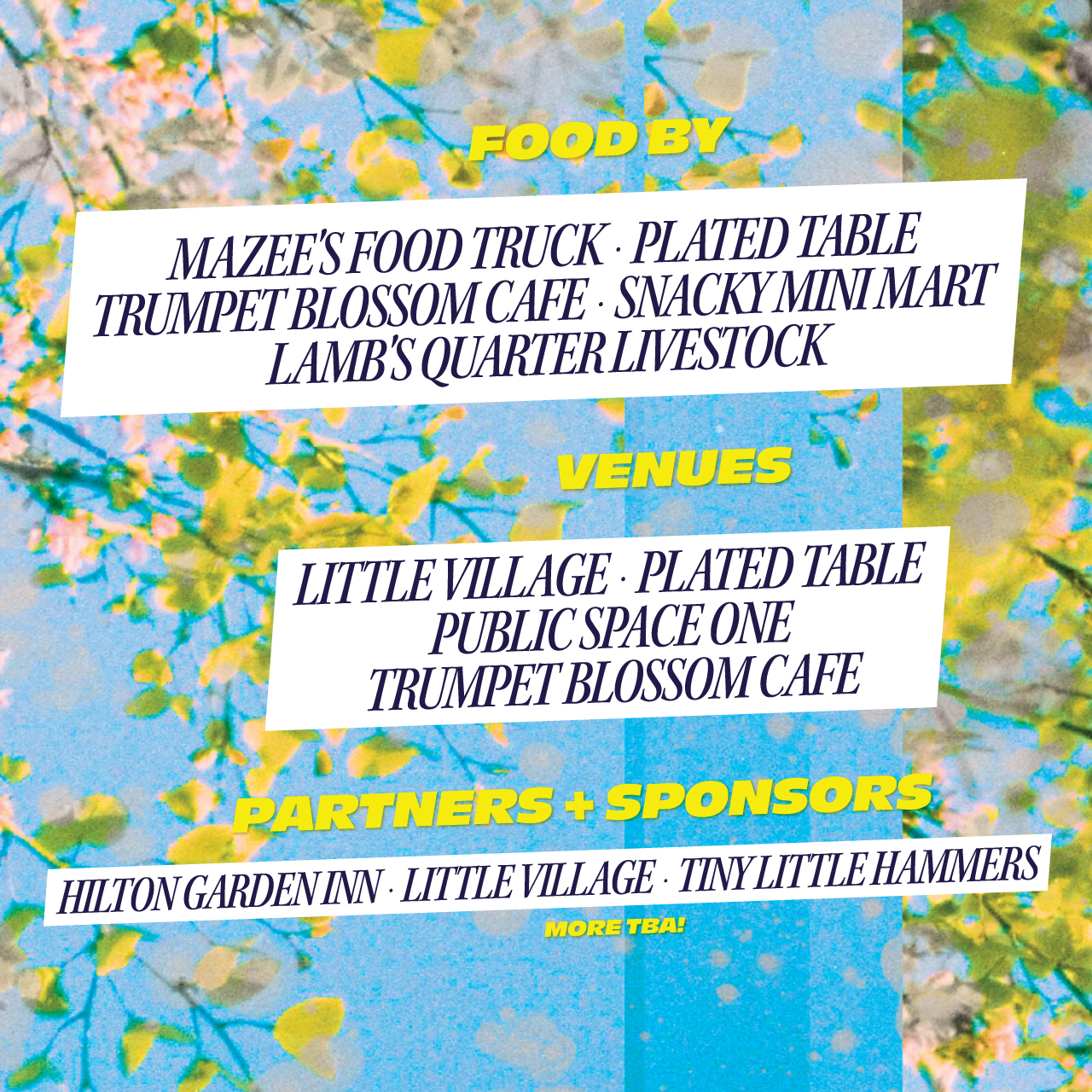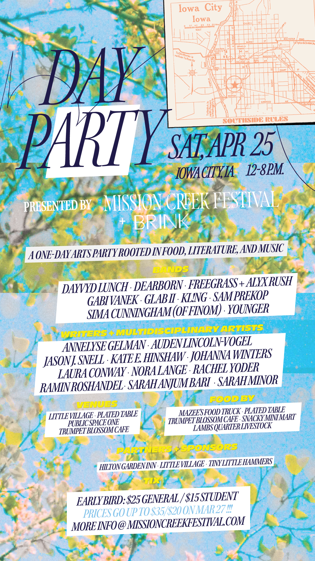 From the founders of Mission Creek Festival and Brink, we present Day Party: a one-day, intimate arts experience rooted in food, literature, and music. Day Party embodies the magic of finding new art, friends, and community during the expansive daylight hours of a late-spring weekend. Equal parts wit and grit, we are a gathering place for local and Midwestern creativity. The event runs from early afternoon to early evening; there will be live music, readings & conversations, and a range of food experiences from local chefs. The festivities take place in a creative nook on Iowa City's southside, hosted at emerging and iconic spaces: Little Village, Plated Table, Trumpet Blossom Cafe, and Public Space One.